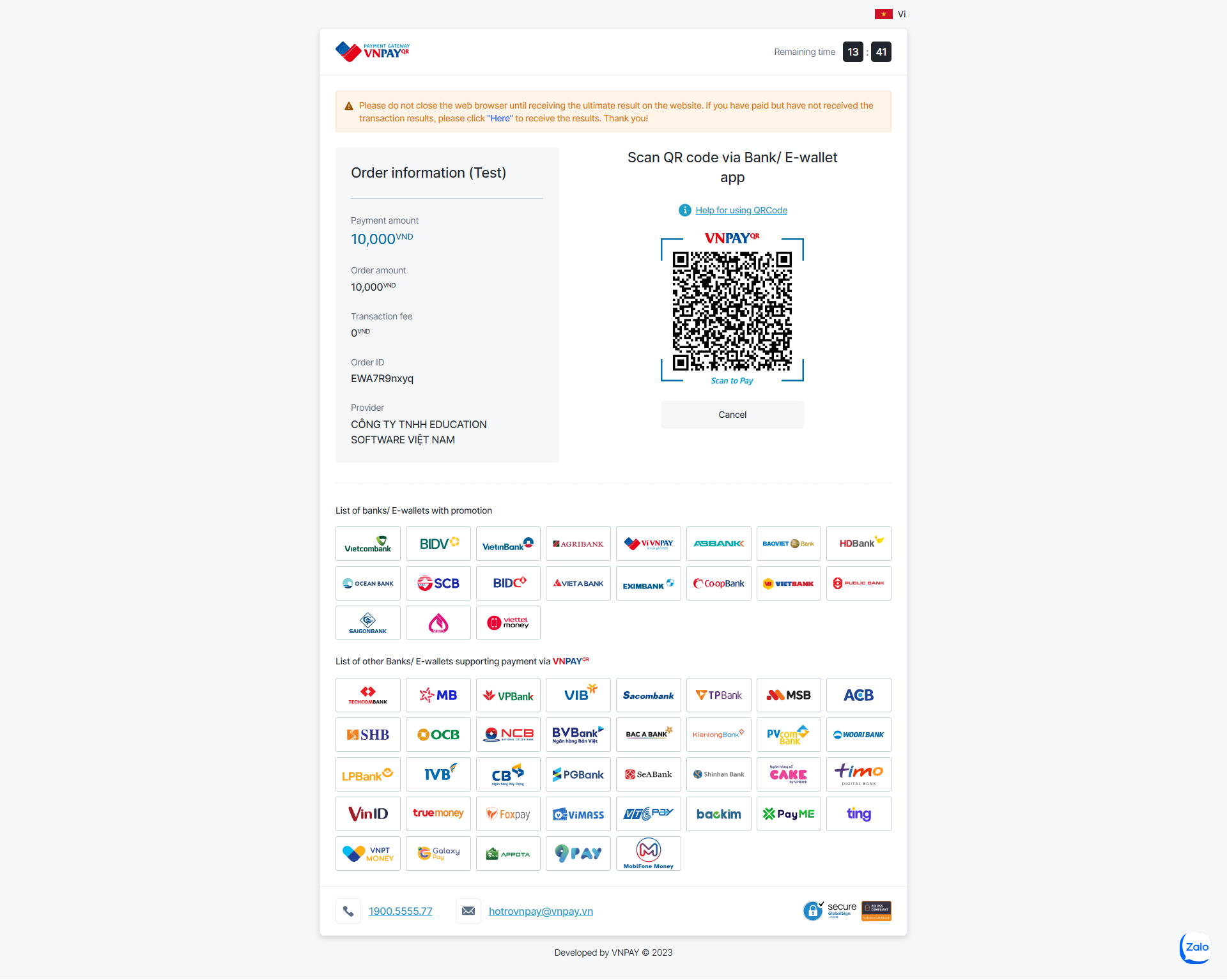 - If the learner has already logged in: the learner will be directed to VNPay Portal to process payment.